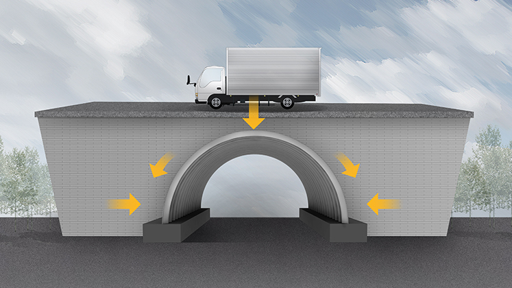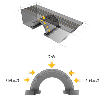 파형강판 구조물 상부에 하중으로 인한 연직토압이 발생하는 경우 측면의 토압이 저항하게 되며, 이때 연직 및 측면토압이 일정하게 이루는 하중분포 형식이 된다. 이같은 하중분포(환 압축 효과)는 휨모멘트를 억제하며, 압축력이 작용하는 구조적 특성을 갖는다.