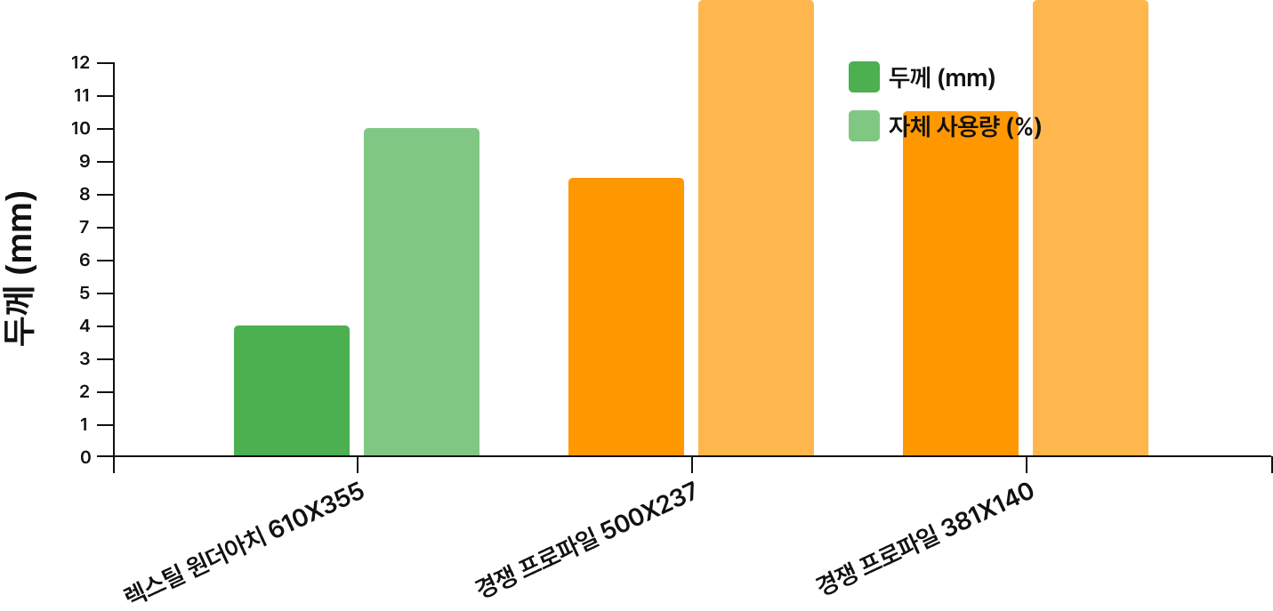 *두께 기준 상대적 자재 사용량: 렉스틸 원더아치 610x355를 100%로 설정